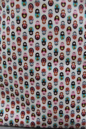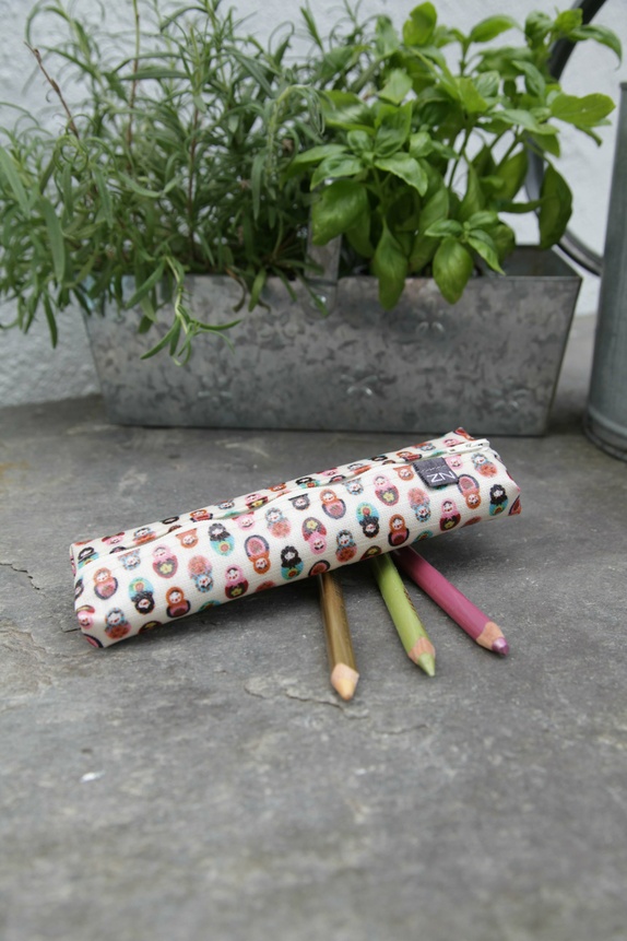 Lite pennal sydd i et beige plastbelagt bomullsmateriale med små babusjkadukker. Her er det plass til det viktigste: penn, blyant og et viskelær.