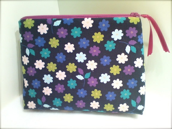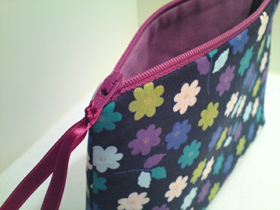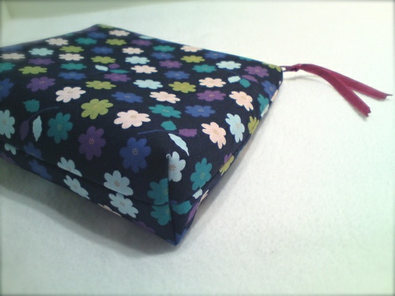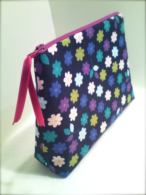 Enkel og elegant pung i mørk blå bomull med blomster. Foret med syrinfarget bomull.