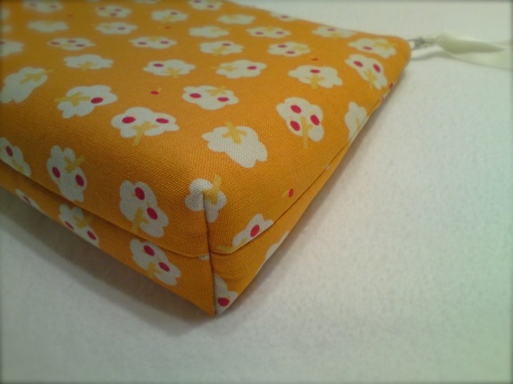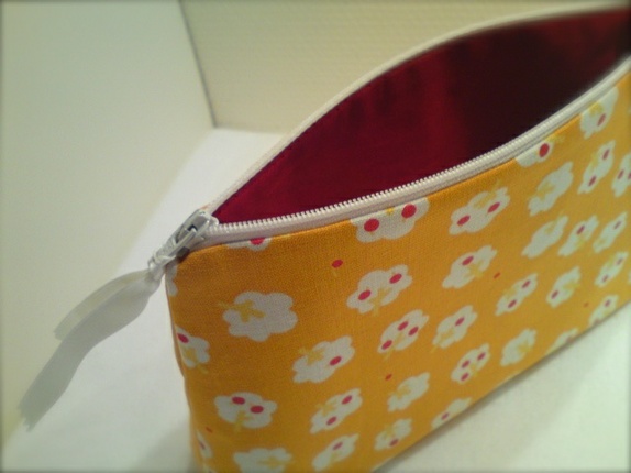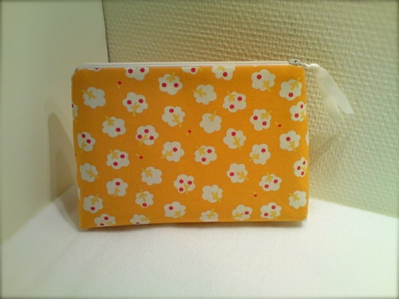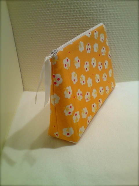 Enkel og elegant pung i varm gul bomull (god kvalitet) med kirsebærtrær? Foret med rød bomull.
