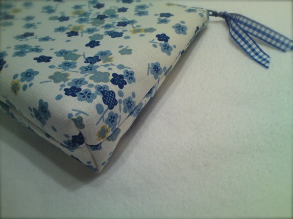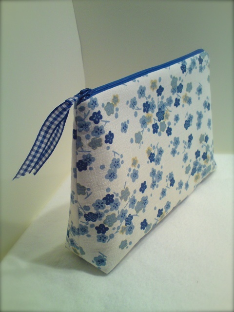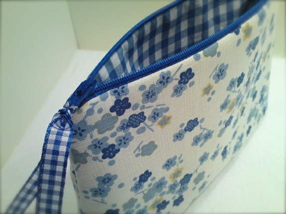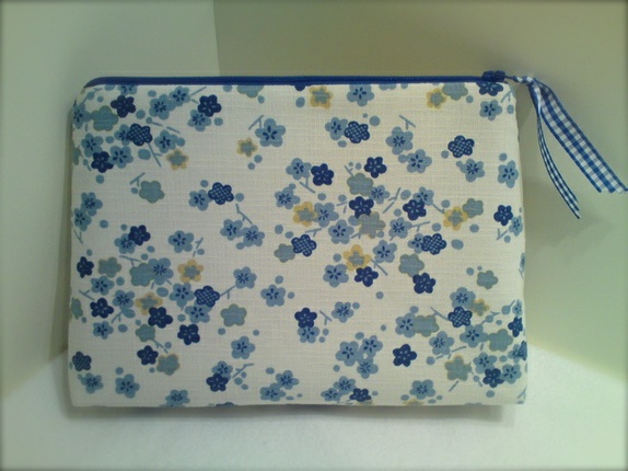 Enkel og elegant pung i japansk bomull med blå blomster. Foret med blå rutete bomull.