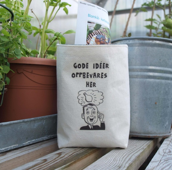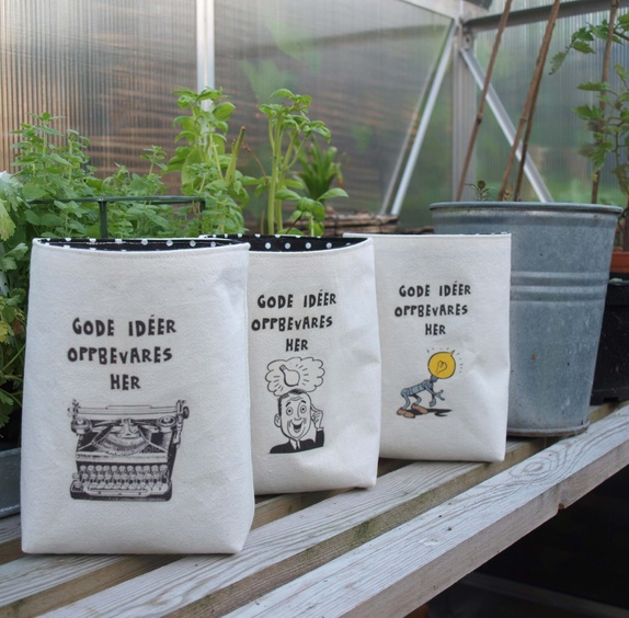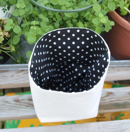 Sydd i bomull med påstrøket motiv.Foret med sort stoff med hvite prikker.Ingen synlige sømmer inni.Vliselin mellom lagene.Bredde: 12 cmDybde: 8 cmHøyde: 17 cm