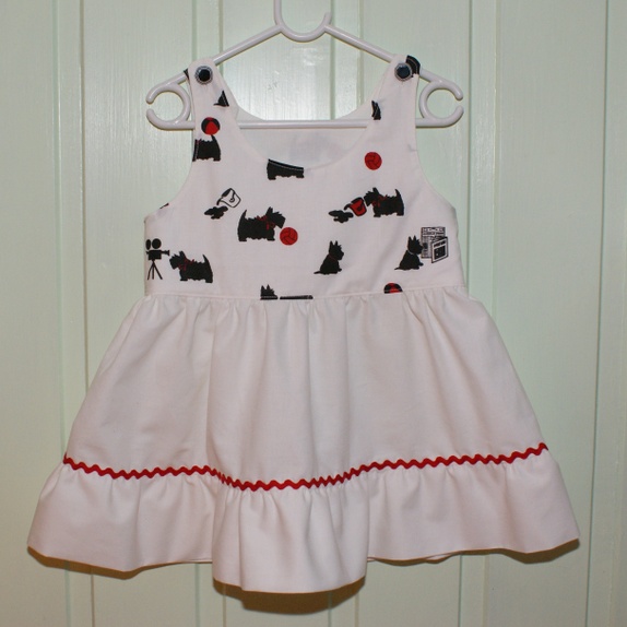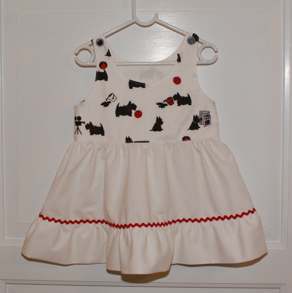 Overdelen er sydd i dobbelt stoff. Skjørtet og kappen er sydd av bomull fra Solberg. Pyntet med rød kroklisse. Knepping på skuldrene. Fin til en liten jente som er glad i hunder!