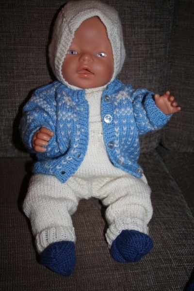 Skidress til Babyborn i ull. Består av jakke, bukse, sokkar og hjelm