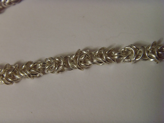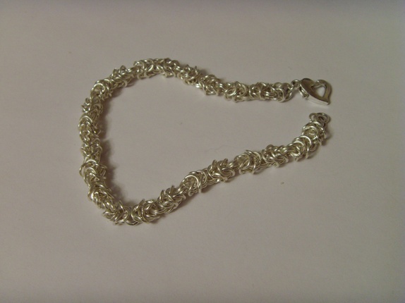 Armbåndet er laget av nikkelfrie små øsken. Det er brukt kongekjede teknikk.