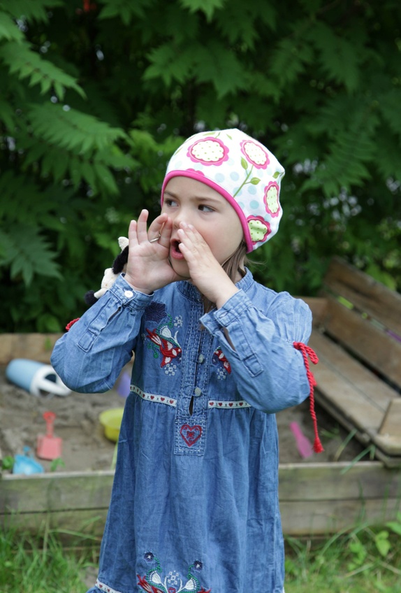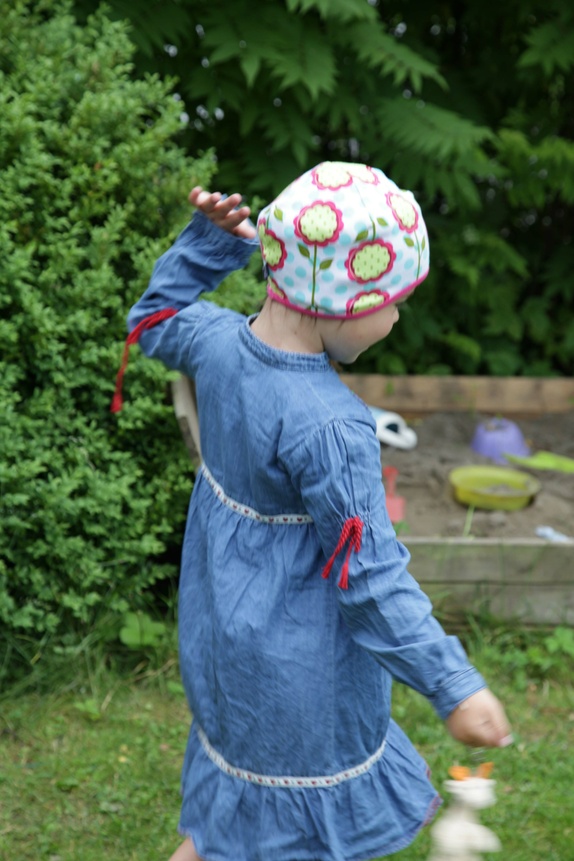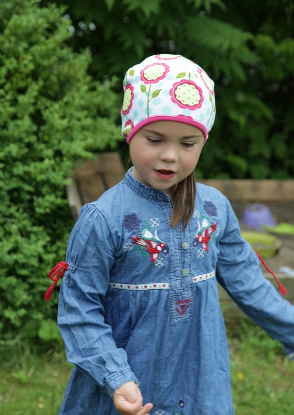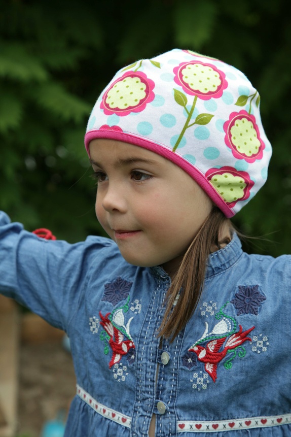 Luen er sydd i en hvit jersey med store solsikker i rosa, gult, grønt og turkis. Avslutningen på luen er kantet med en myk rosa jersey. Luen finnes i 4 størrelser: XS, S, M og L.