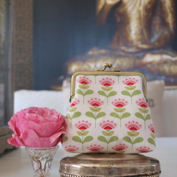 Portemone sydd i stoff fra PanduroForet med rosa /hvite prikker stoffvliselin mellom lagene.Veskelås av messing, måler 10,2 cm.Portemone målerpå det bredeste: 12 cmhøyde : 13 cm