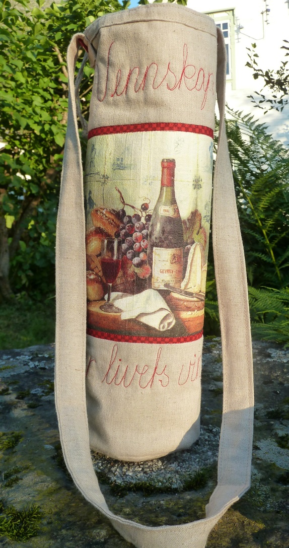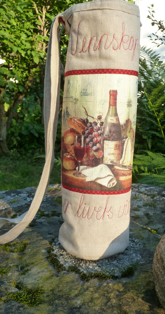 Vinveska er laga i lin - med motiv i decoupage på lin.