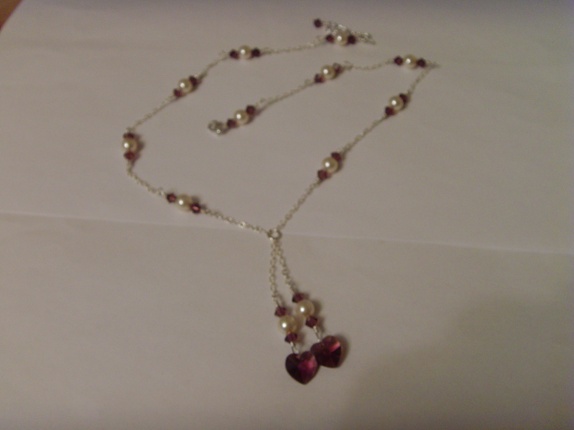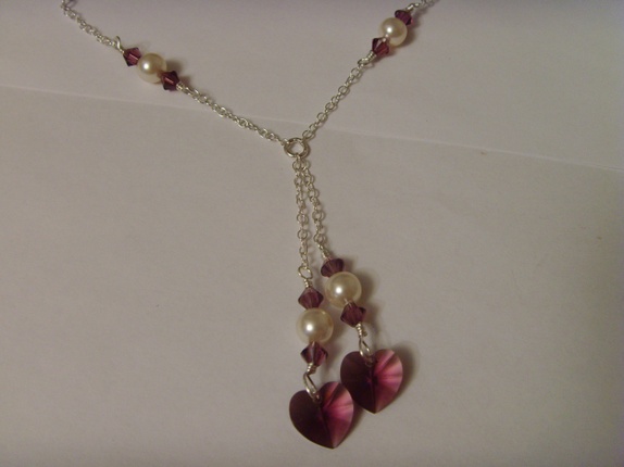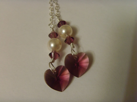 Nydelig smykke med swarovski perler og krystaller. Perlene er i fargen Creamrose og krystallene er Amethyst. Perlene er 6mm og krystallene er 4mm. Hjerteanhengene har også fargen Amethyst og er 10mm store. .