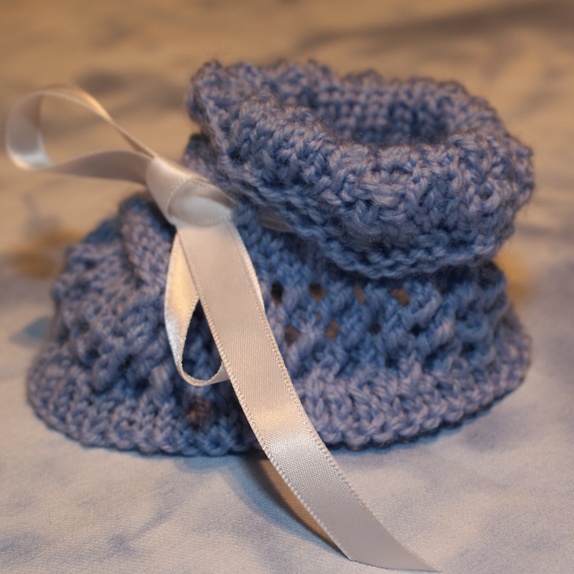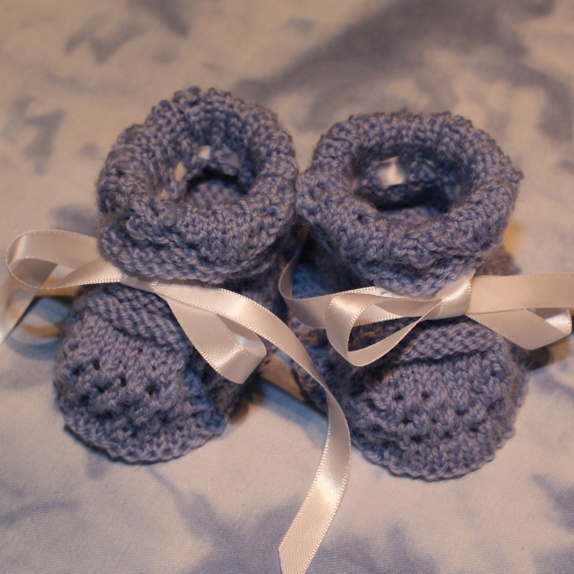 Lyseblå babysokker strikket i babyullgarn som kan vaskes på ullvaskprogram i vaskemaskin. Hvite satengbånd.