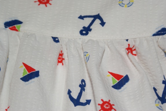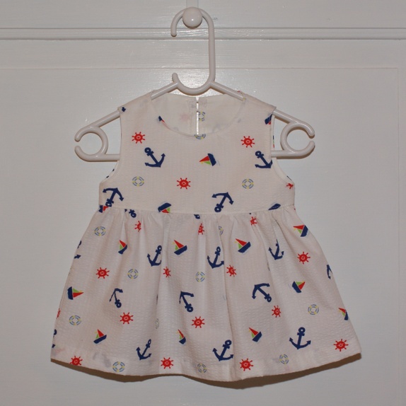 Liten, søt sommerkjole til baby. Kjolen er i et hvitt "lille martine"-stoff med maritime motiver i blått og rødt. Overdelen er foret. Det er splitt bak , og kjolen lukkes med en knapp bak i nakken