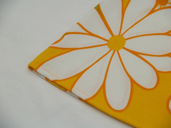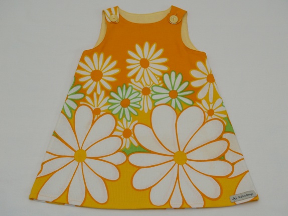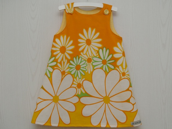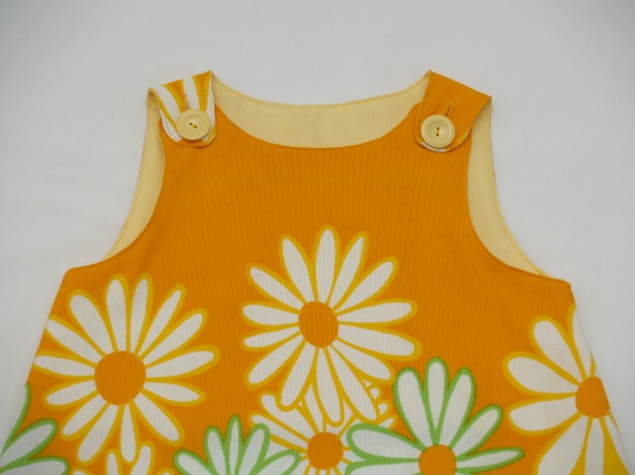 Gul og glad hengslekjole med storblomstrete motiv. Samme motiv foran og bak. Sydd av en duk. Kjolens overdel er foret med et ensfarget bomullsstoff.