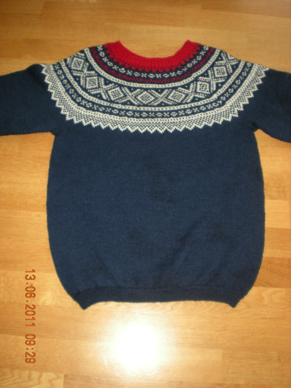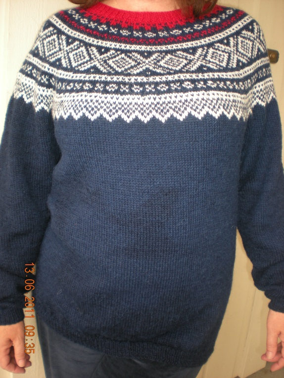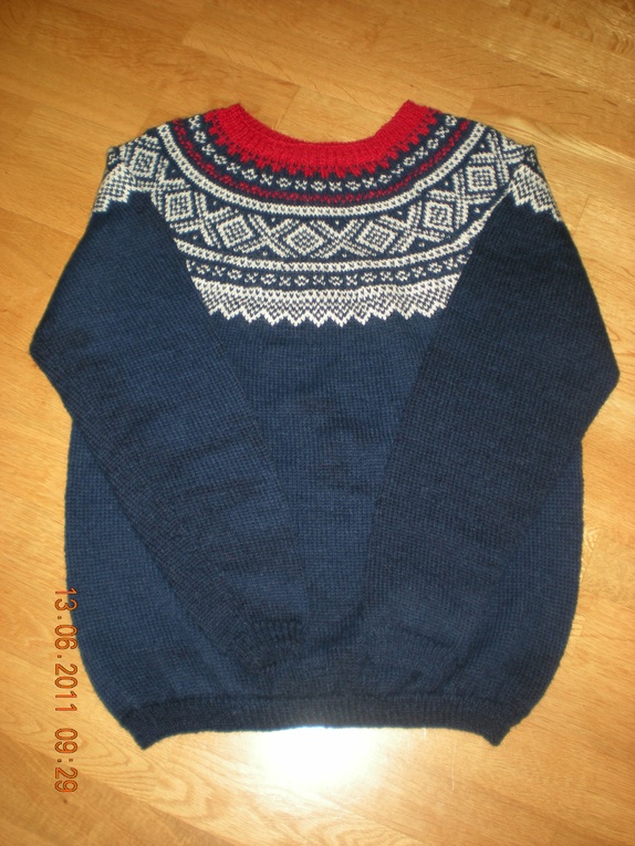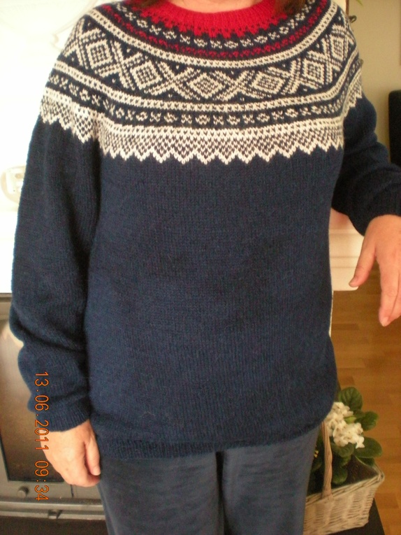Fargene er blå, offwhite og rød.Hel lengde ca. 64 cm.Overvidde ca 98 cm Ermlengde ca 48 cm