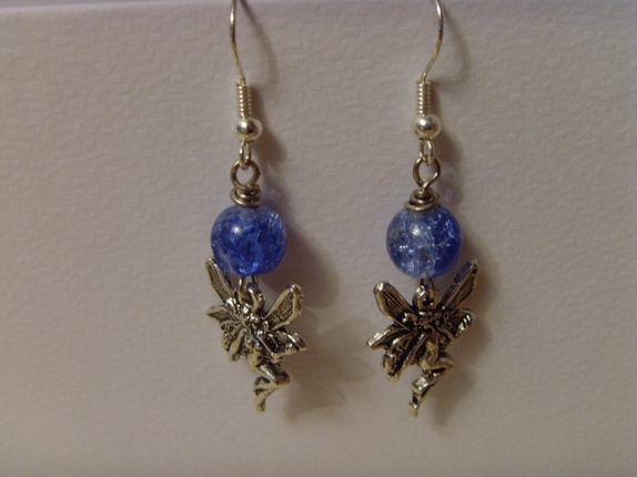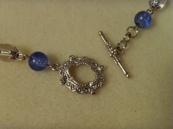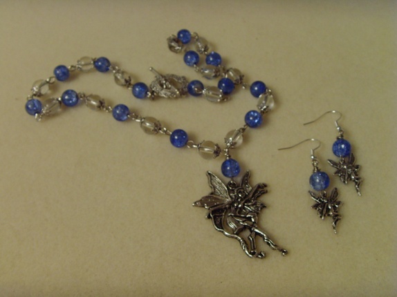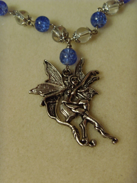 Smykket er ca 48 cm langt. det består av blå krakkelerte glassperler, og blanke glassperler som er omsluttet av sølvfargede perlecaps. Fe-anhenget er ca 5 cm langt.