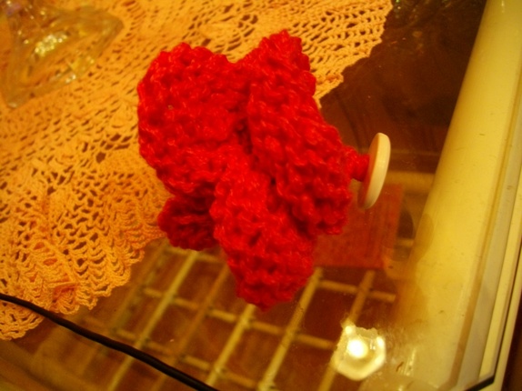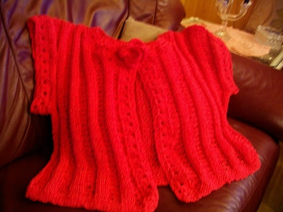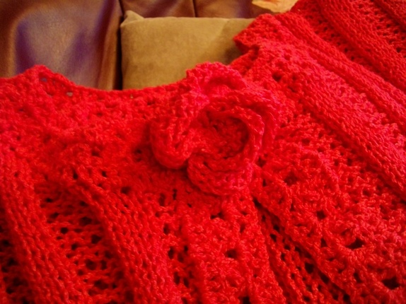 Strikket i FrotoLett, og kantet med heklekant.En liten "rose" er løs med knapp bak, den gjør plagget fleksibelt i størrelse da du kan plassere den hvor du vil.
