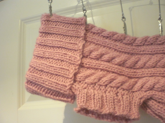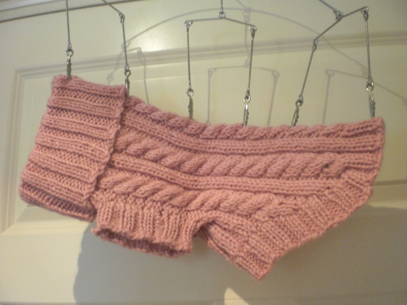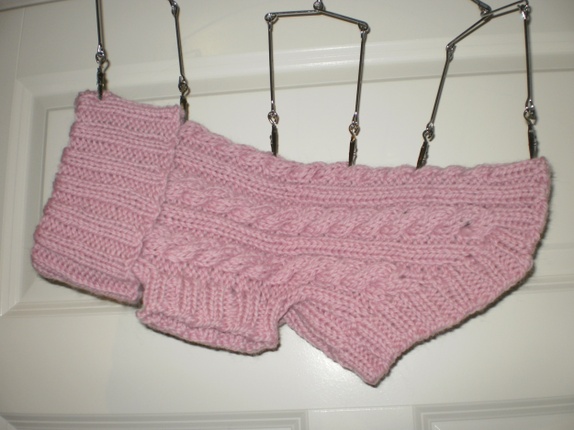 Rosa hundegenser med fletterStrikket i ekstra tykk ull.Lengde: 43 Omkrets: 39Ren ullHåndvask. Strekkes i fuktig tilstand.