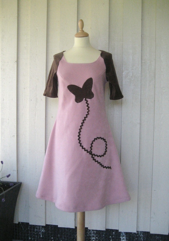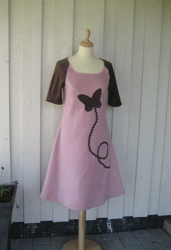 Vakker kjole sydd i rosa polarfleece og brun chenille med halv erm. Kjolen er pyntet med en sommerfugl og kroklissebånd.