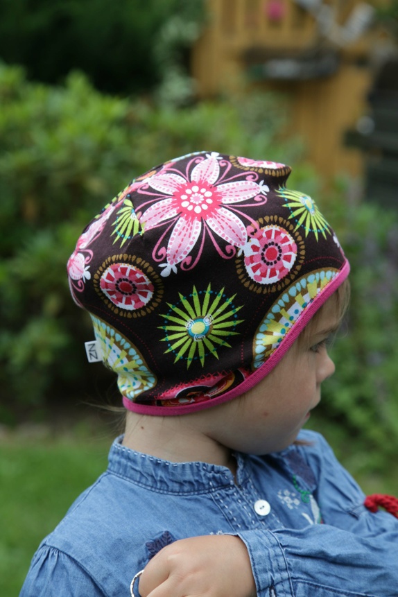 Luen er sydd i en brun jersey med blomster både her og der i rosa, lysgrønt, oransje og turkis. Avslutningen på luen er kantet med en myk rosa jersey. Luen finnes i 4 størrelser: XS, S, M og L.