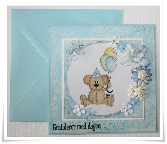 Kortet er i 13x13 str og levers med farget konvulutt som på bilder. Dette kortet er kun dekorert på forsidenstemplet er malt med hånd. Stemplet er fra karensdoodles.