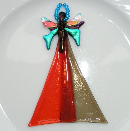 En vakker engel i kunstglass med dichroic innslag.13 cm. Et blikkfang for ditt vindu.En av sitt slag.