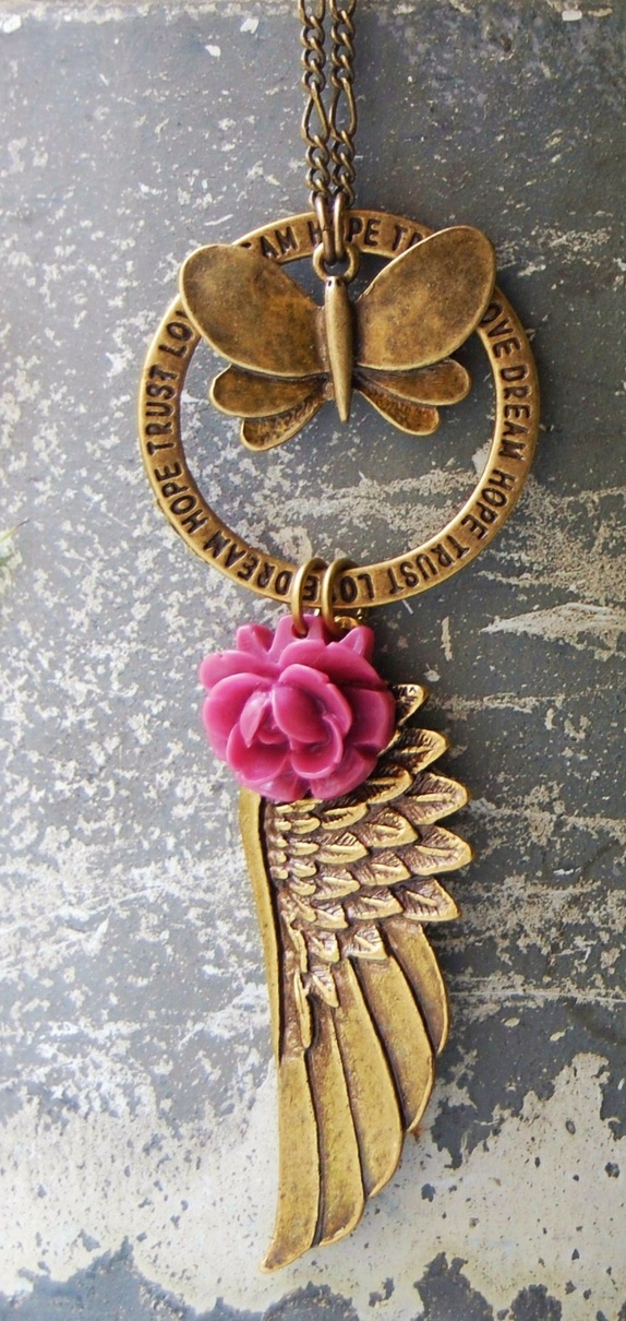 Antikkgull kjede med vinrød luciteblomst.Lenken måler 78 cm inkl låsen.Anhenget måler 9 cm.