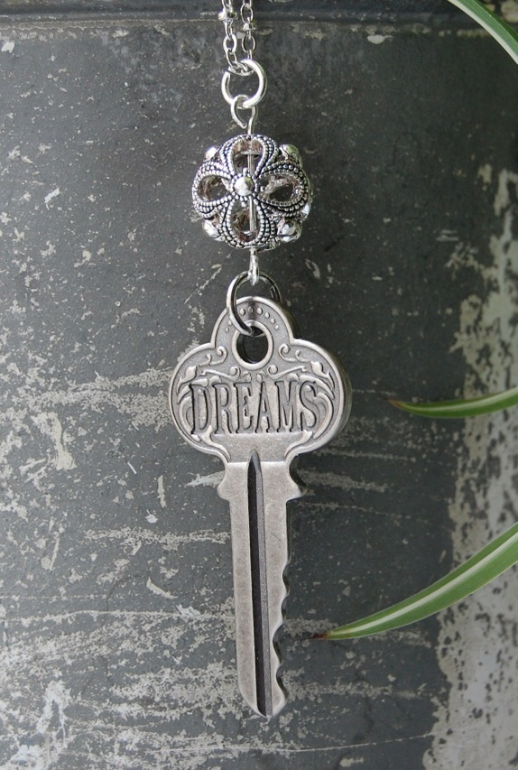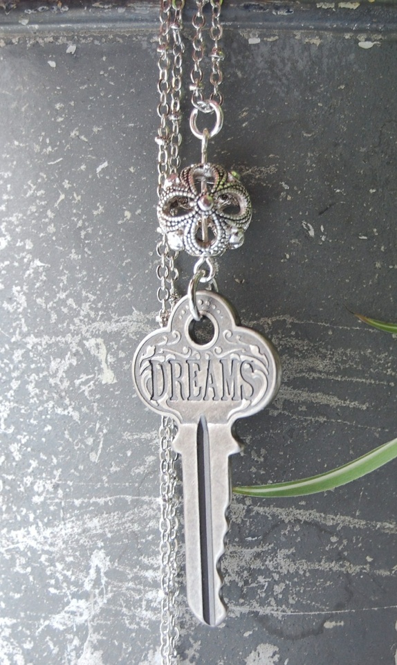 Langt kjede med nøkkelannheng og sølvbelagt metallperle.