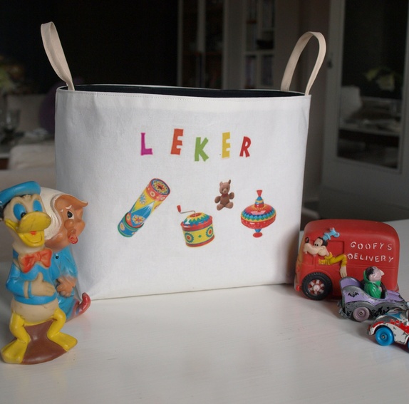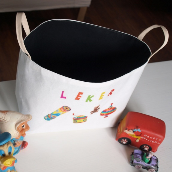 Tøypose/boks til oppbevaring av leker.Sydd i hvitt bomull fra panduro,foret med sort bomullstoff.Påstrøket motiv av vintage leker.Vliselin mellom lagene.Ingen synlige sømmer på innsiden.Bredde: 23 cmHøyde: 21 cmDybde: 12 cm