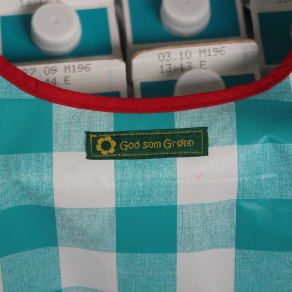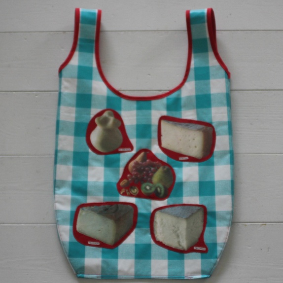 Sydd av turkisrutete voksduk med diverse italienske oster fra et rødt forkle som pynt. Begge deler kommer fra loppemarked. Langs hankene er det rødt skråbånd og på baksiden God som Grønn-merkelapp.
