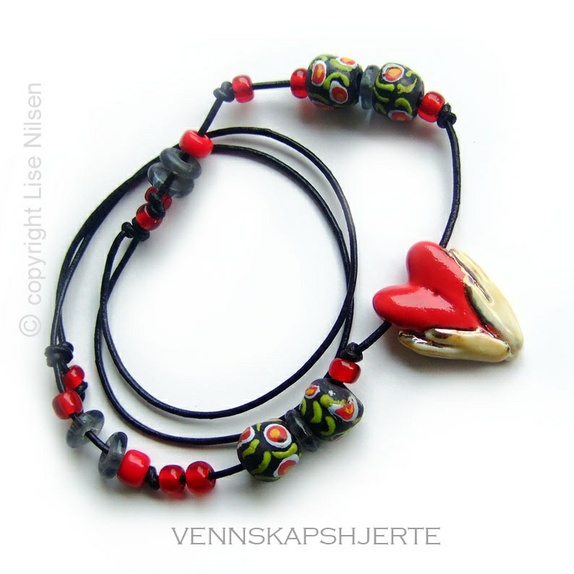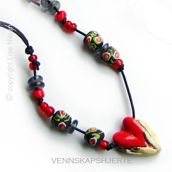 Et unikt og håndlaget hjerte i porselen med fastbrent gull.Jeg har montert det til smykke sammen med håndlagde afrikanske perler av knust glass og vanlige glassperler.herlig smykke til den speseille vennen.Allergisikkert.