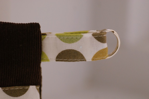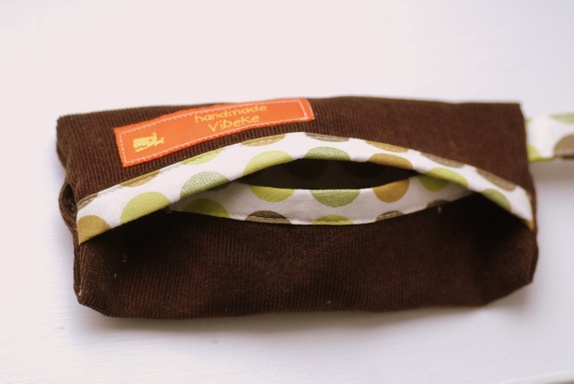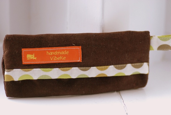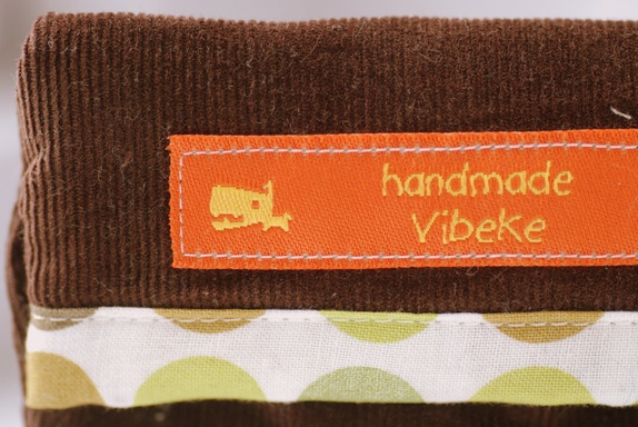 Sydd i brun babykord og foret med grønt og brunt prikkete stoff og strykeinnlegg.