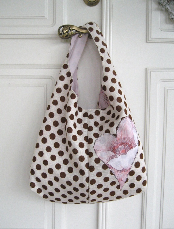 Herlig veske/nett sydd i et slags ull/strielignende stoff med brune polkadots, fòret med rosa vintage bomull. Nettet er pyntet med et stort hjerte av rosa vintage bomull.