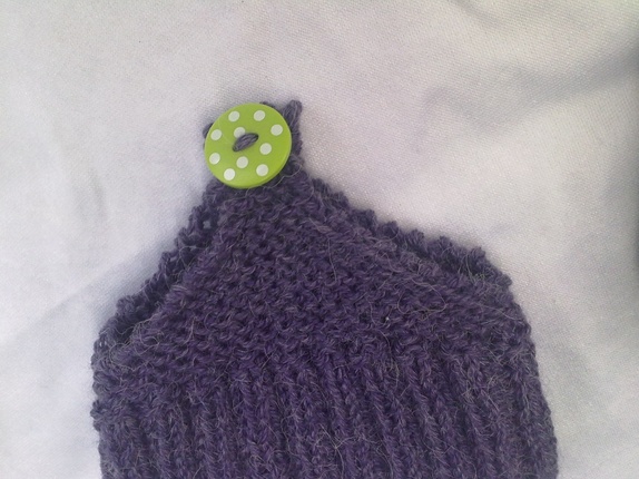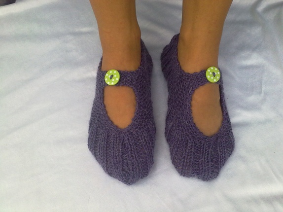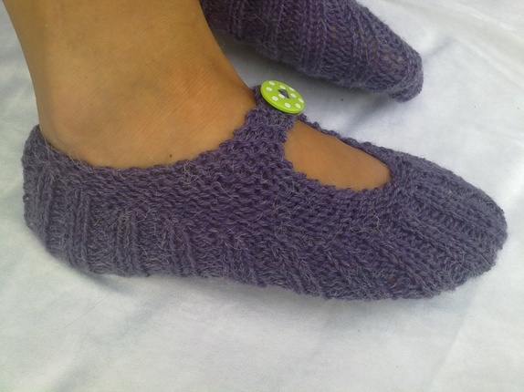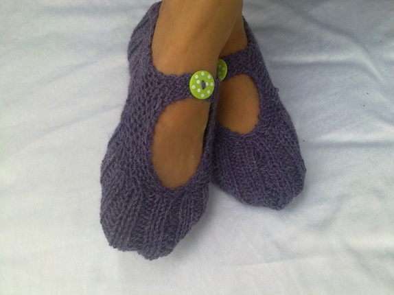 Myke og gode lommetøfler strikket i alpakkagarn, kjekke og ta med seg bort eller som en liten gave til noen. kan brukes sommer som vinter.farge lilla med limegrønn knapp med hvite prikker på.Vaskes i maskin på 30 grader.