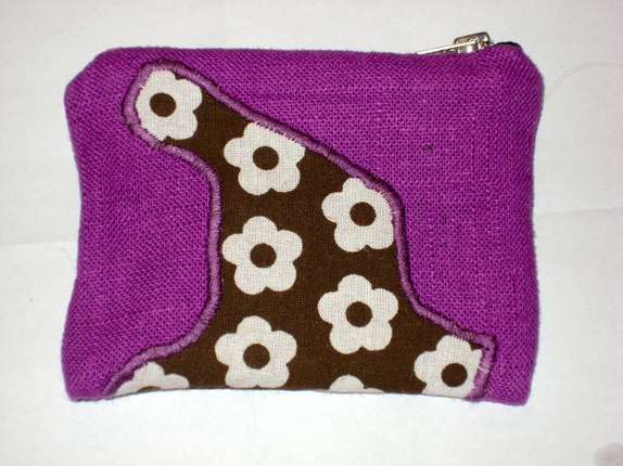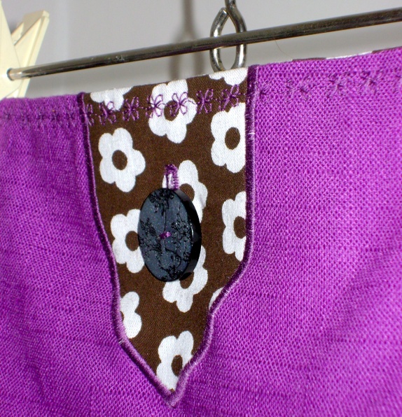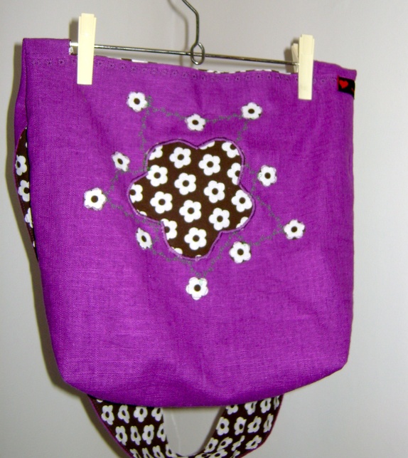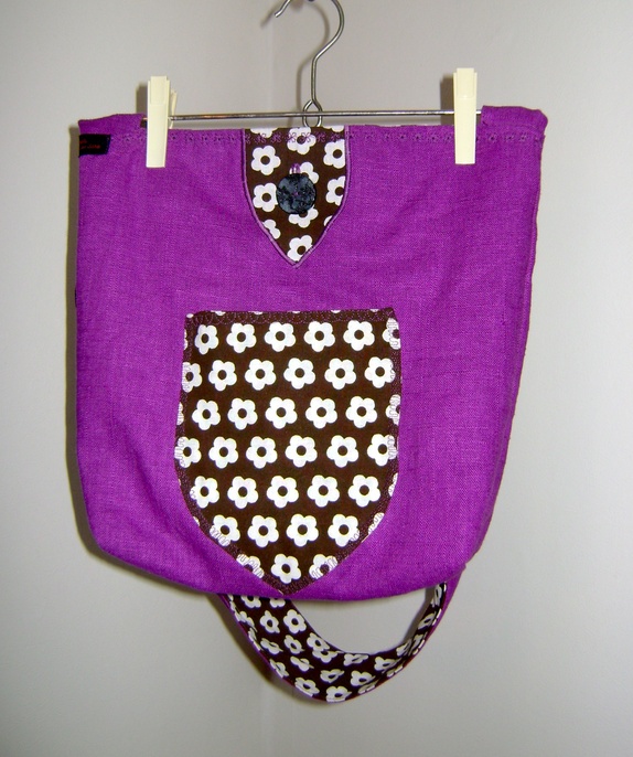 Veske i lilla lin, fora med brunt bomullstoff med blomar på.