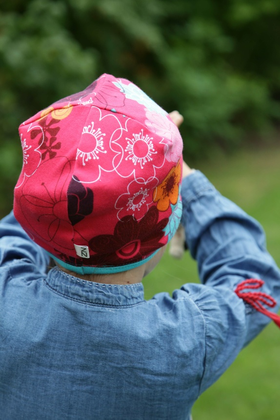 Luen er sydd i en skarp rosa jersey med blomster både her og der i rosa, lilla, oransje og turkis. Avslutningen på luen er kantet med en myk turkis jersey. Luen finnes i 4 størrelser: XS, S, M og L.