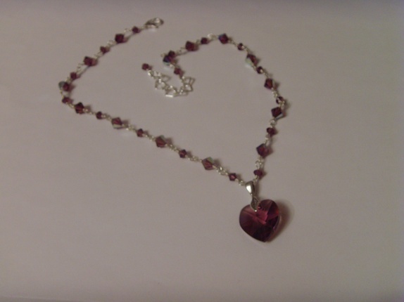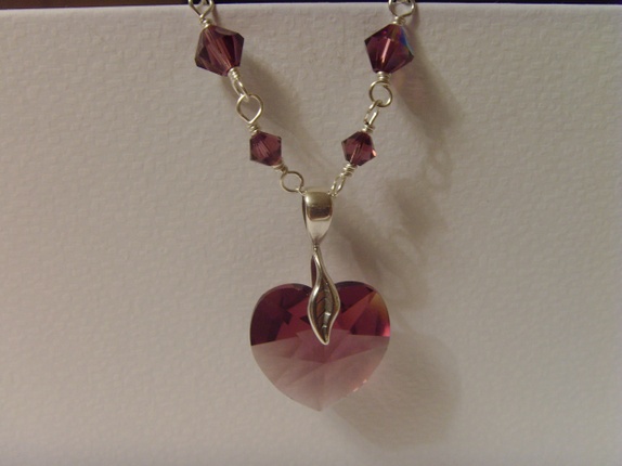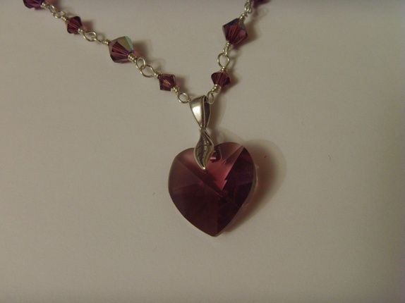 Swarovski krystallene er alle i fargen Amethyst. Krystallene er 4 og 6mm store. Og 6mm krystallene har en AB coating som gjør de ekstra glansfulle. Mellom hver krystall er det 6mm store tvunnede ringer i 925s sølv. Hjertet er 18mm stort.