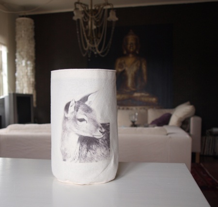tøypose til oppbevaring.sydd i bomulls stoffmed vliselin mellom lagene.Påstrøket motivForet med brunt bomulls stoffHøyde 19,5 cmDiameter: 12 cm