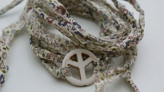 Peace tegn av sten som måler 2,5cm i diameter. Med revet Liberty stoff som ligger dobbelt og måler da ca 68cm hver.