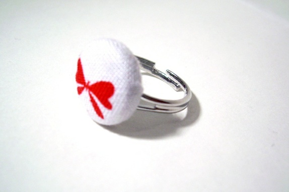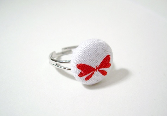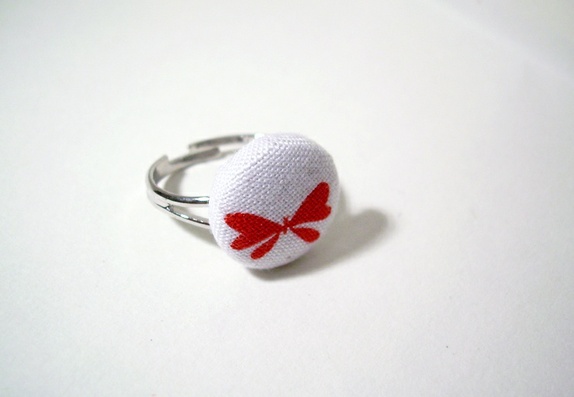 Søt ring med knapp trukket i bomullsstoff, rød sommerfugl.