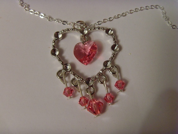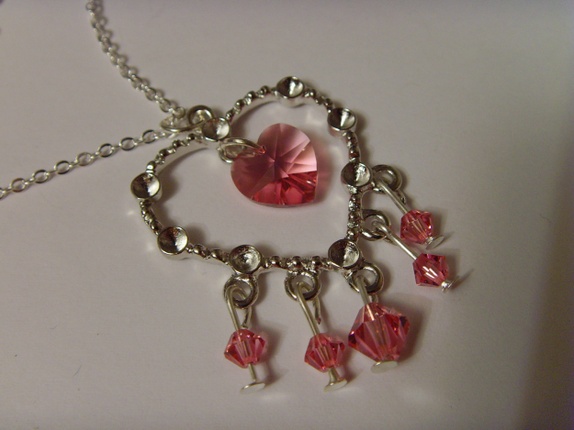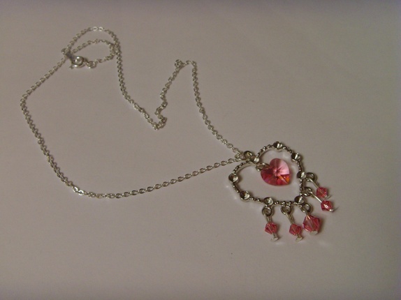 Enkelt kjede med hjerteanheng i nikkelfritt sølvfarget metall. Det henger swarovskikrystaller i diverse størrelser på anhenget. Alle i fargen Rose.