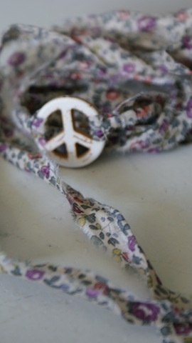 Peace tegn av sten som måler 2,5cm i diameter. Med revet Liberty stoff som ligger dobbelt og måler da ca 68cm hver.
