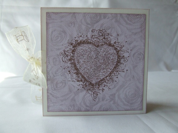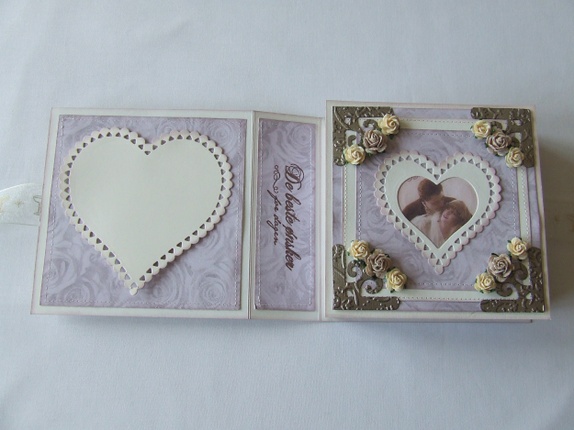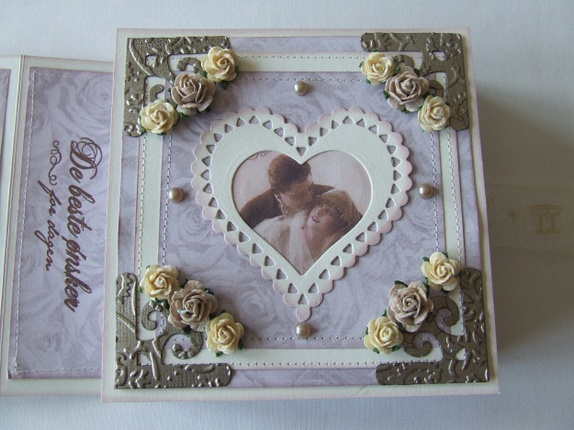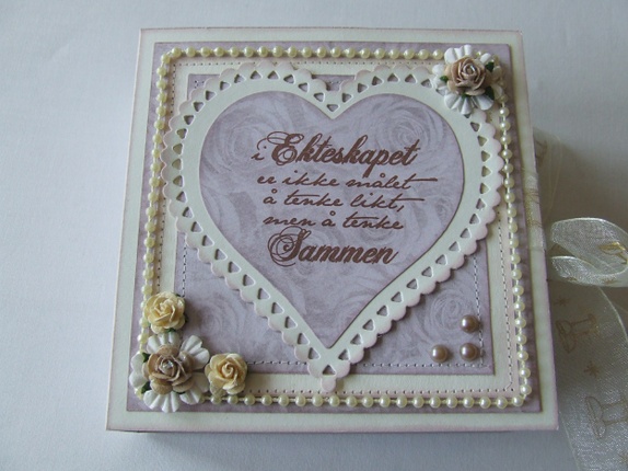 Pyntet med mønsterpapir, perlebånd, halvperler, roser, metallhjørner, kakeserviett, maskinsøm og stempel.