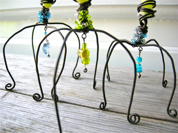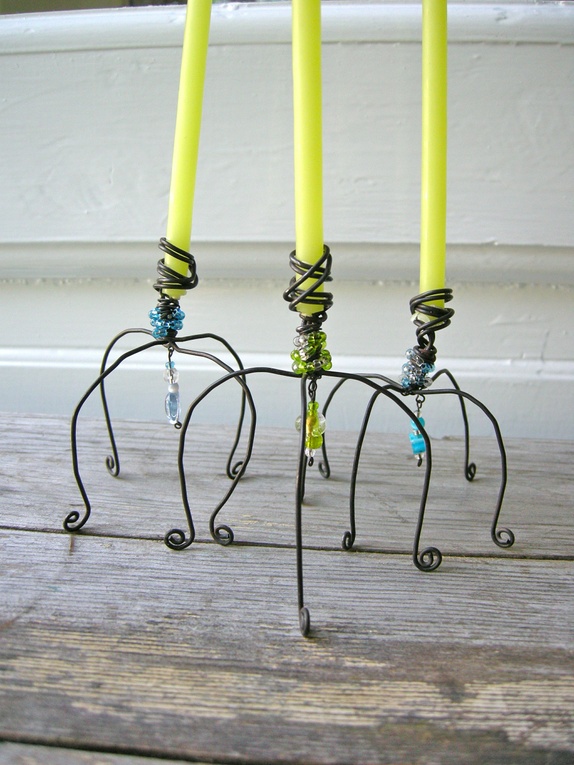 3 herlige lysestaker laget av "elefant" tråd og glassperler.Utrolig fine med tynne lange lys feks fra Broste.