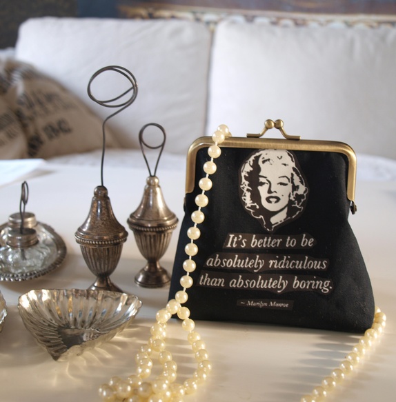 Portemone sydd i bomullstoff med påstrøket motiv. Foret med rosa/hvitt polka dot stoff vliselin mellom lagene. Veskelås av messing, måler 10,2 cm. Portemone måler på det bredeste: 12 cm høyde : 13 cm