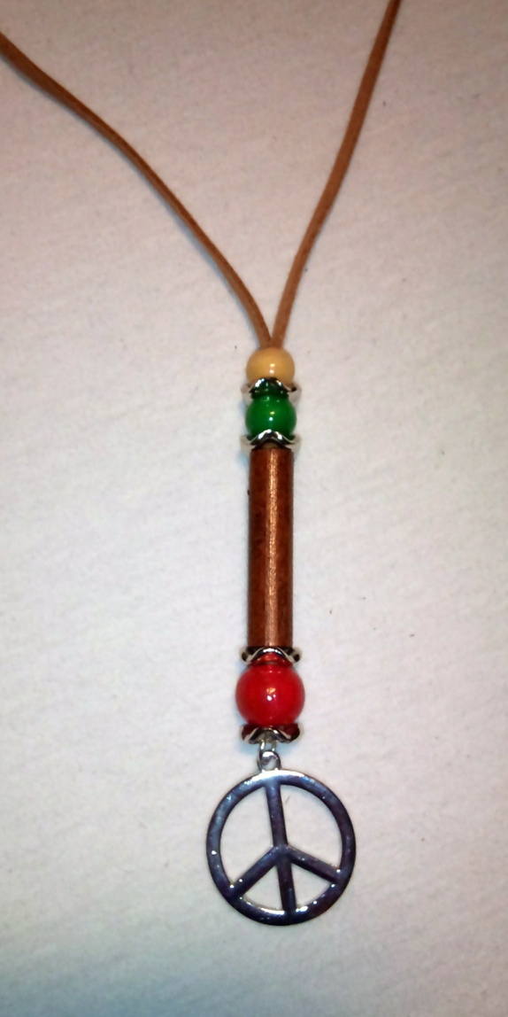 Kjede i brunt skinn (ca 85 cm - men du kan selv justere lengden). Treperler i ulike farger (rastafari-style), trestykke i midten, fredssymbol og sølvfargede mellomledd.