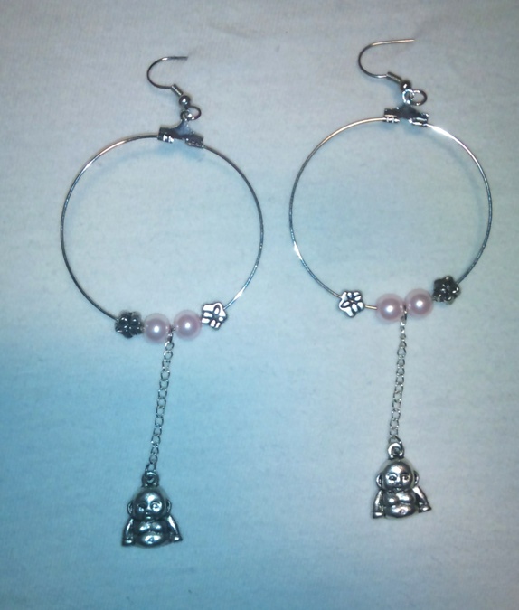 Forsølvede øreringer, pudderrosa voksperler, forsølvet lenke, sølvfargede buddhafigurer, mellomledd med blomst-motiv.