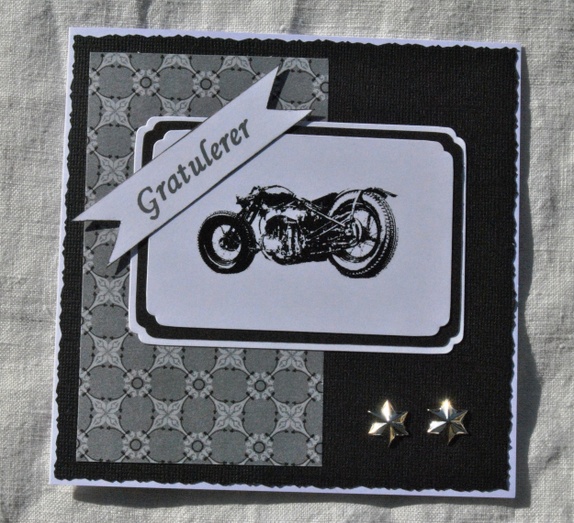 Tøft svart og hvitt kort med motorsykkel og to stjerner nederst.