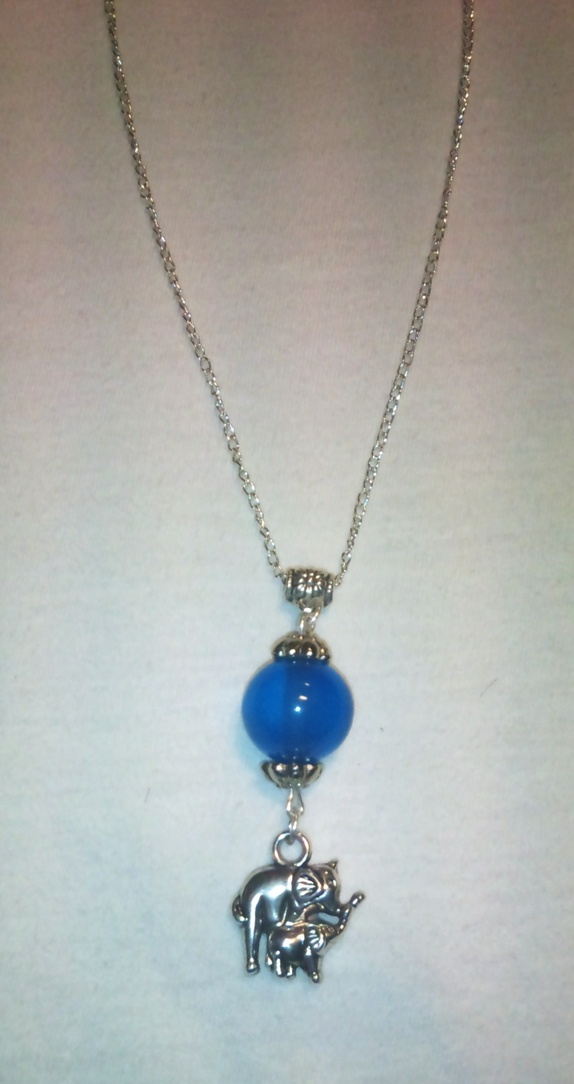 Forsølvet kjede (50 cm). Kombinert anheng med blå plastkule og elefantfigur.