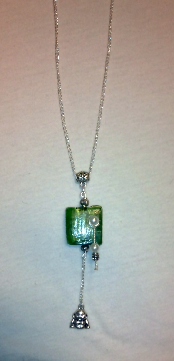 Forsølvet kjede (50 cm). Grønt glassanheng dekorert med hvite voksperler, nedenfor anhenget henger en buddhafigur under forsølvet lenke.