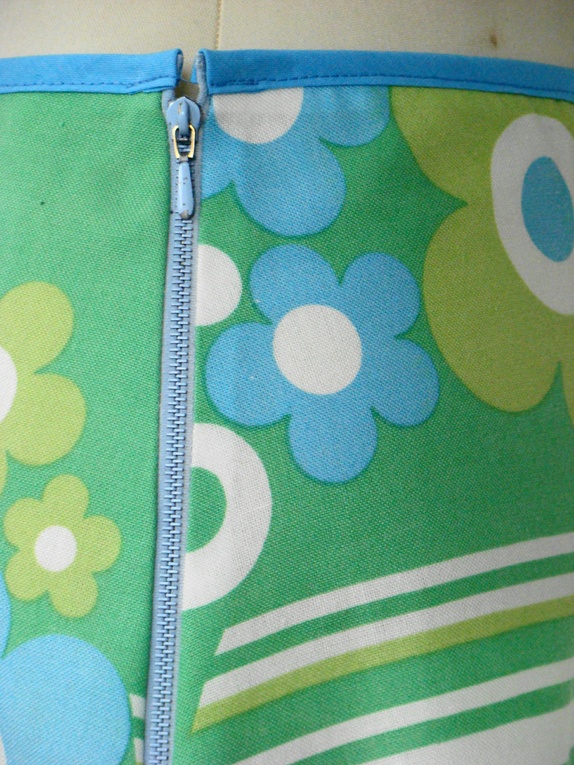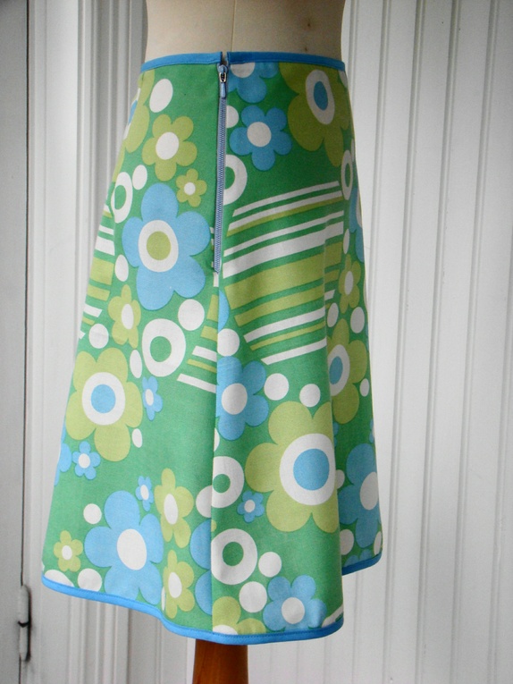 A-formet skjørt sydd i gjenbrukt stoff med fint blomsterprin i forskjellige grønnyanser, blått og hvitt. Stoffet er kjøpt på marked, og det er usikkert om det er av nyere dato eller vintage, men det ser helt ubrukt ut. Matchende blå kantebånd oppe og nede på skjørtet. Vintageglidelås i metall i siden ( ubrukt).