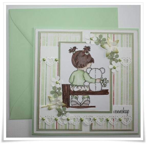 Kortet er i 13x13 str og levers med farget konvulutt som på bilder. Dette kortet er kun dekorert på forsidenstemplet er malt med hånd.