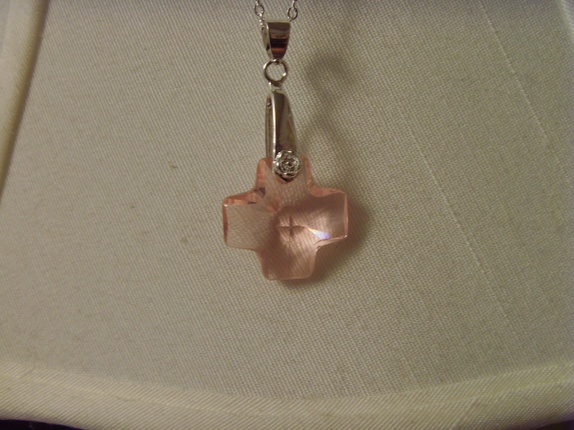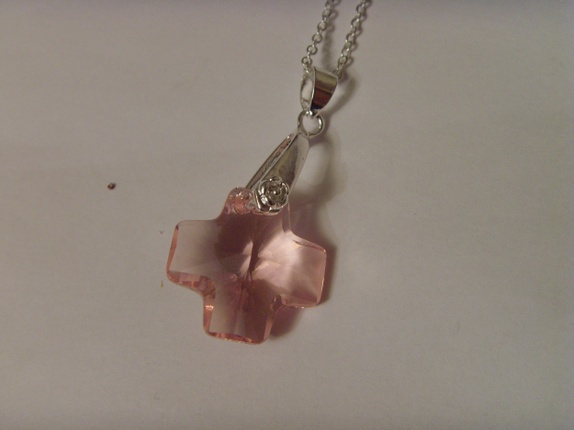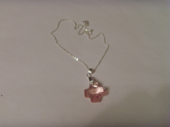 Enkelt smykke med rosa anheng i krystall. Ligner på swarovski.